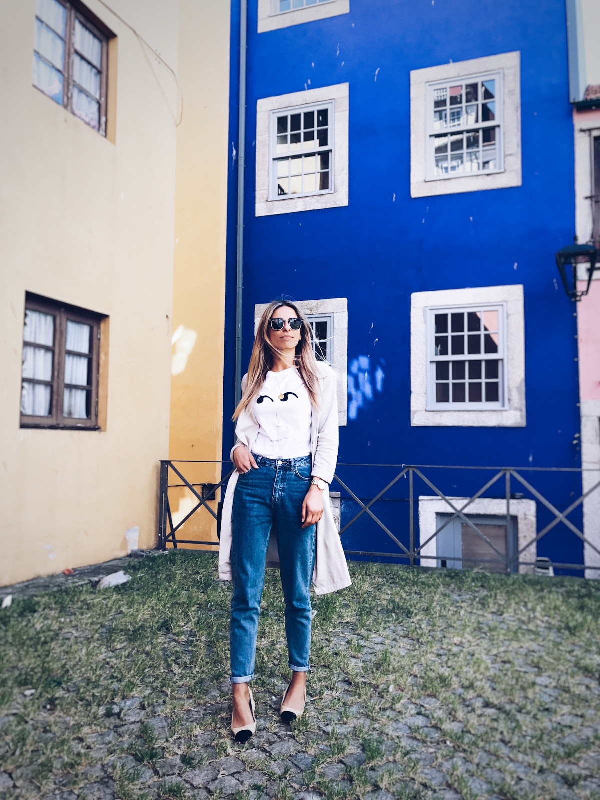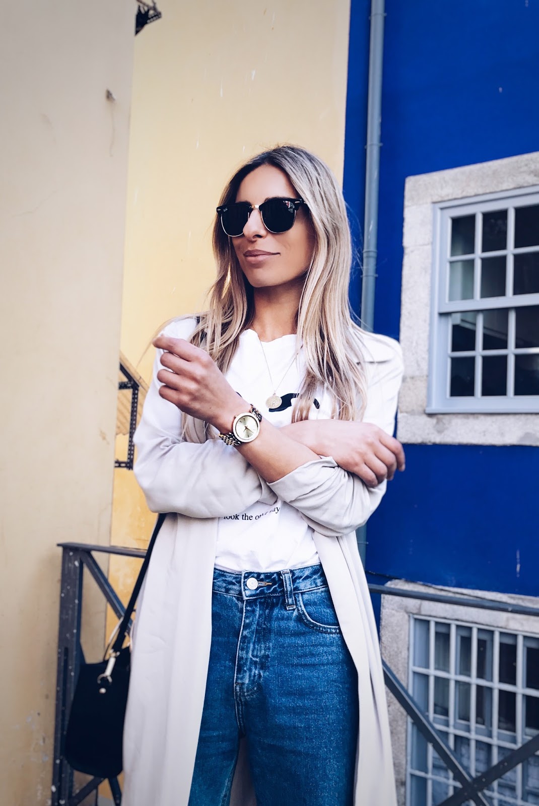 trench Stradivarius | jeans, sapatos, tshirt Zara | sunnies Ray Ban | relógio MK | colar Cinco Store