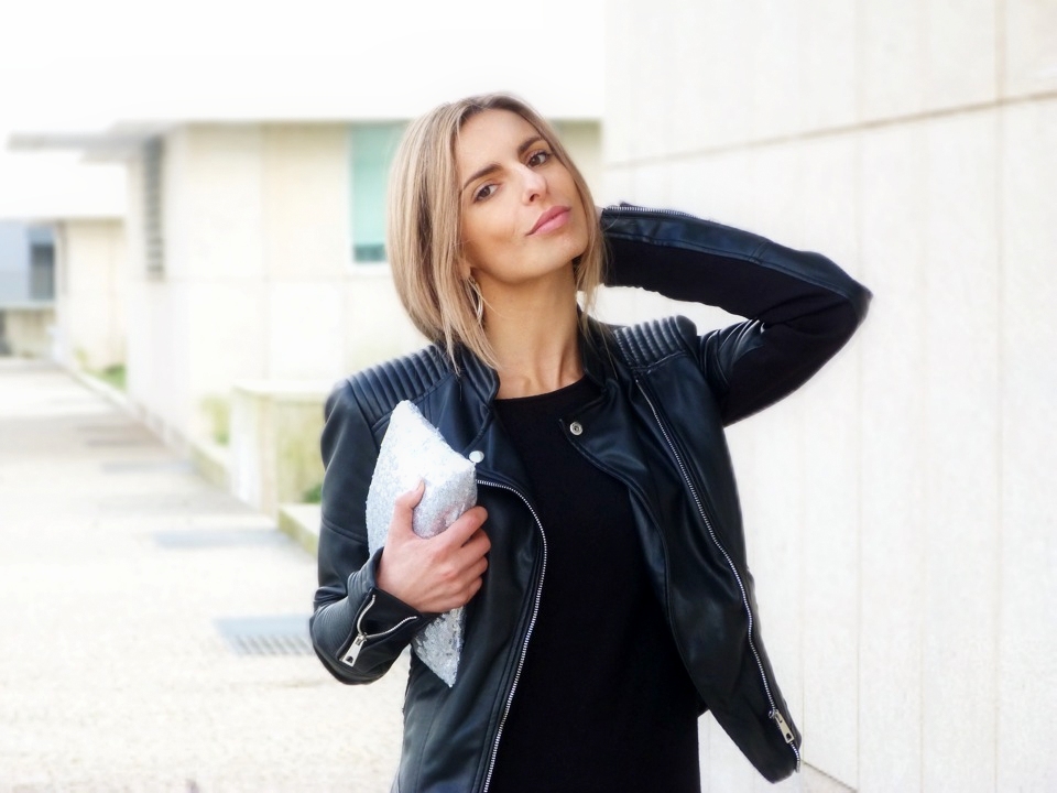 Um pouco de rock no look! A harmonia entre o preto, o brilho do prateado, o blusão de pele e muito estilo nos botins a contrastar com um vestido que tem tanto de simples como de sexy.