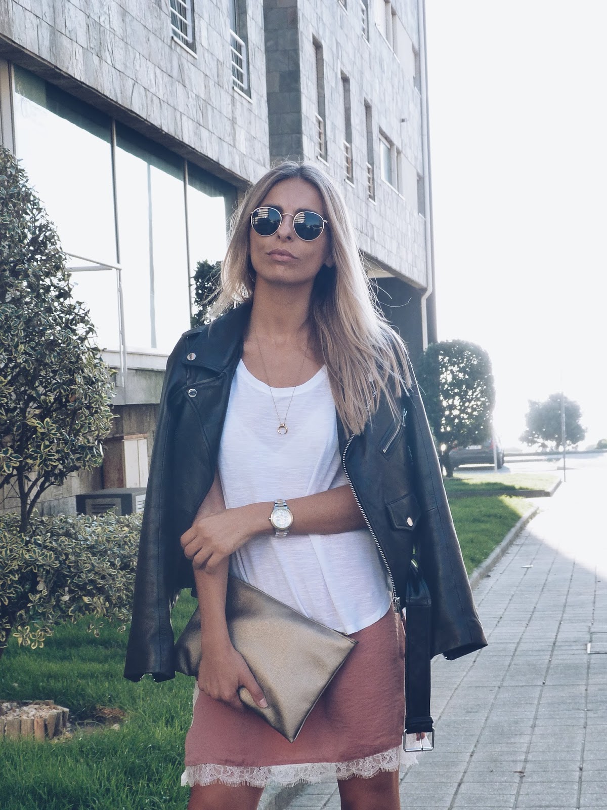 leather biker Zara | skirt Mango | t-shirt Lefties | sneakers Adidas | clutch BYOU | watch Eletta